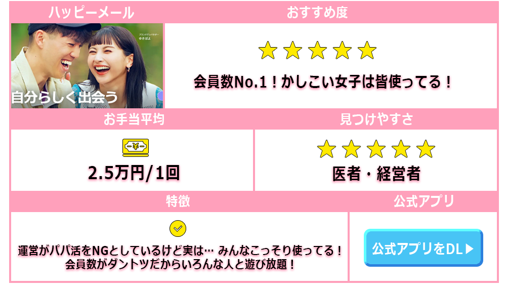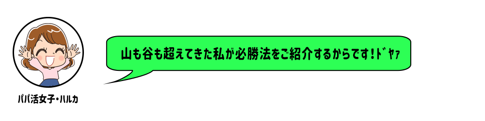 なので、①出会いやすいサービスを賢く選ぶこと②まずはサイト内でお相手としっかりとやりとりをすることこの2点を押さえてパパをゲットしましょう!