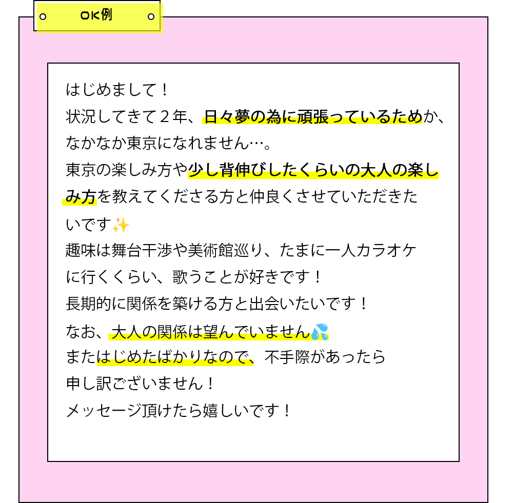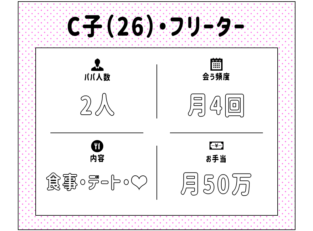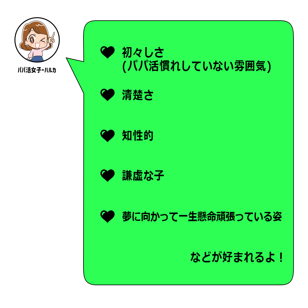 パパたちは文面から人柄を想像して、一緒にいて楽しそうな女の子を探しているので、文章で好感度とどんな子なんだろう~と想像できる余白を散りばめてあげられるとGOODです!