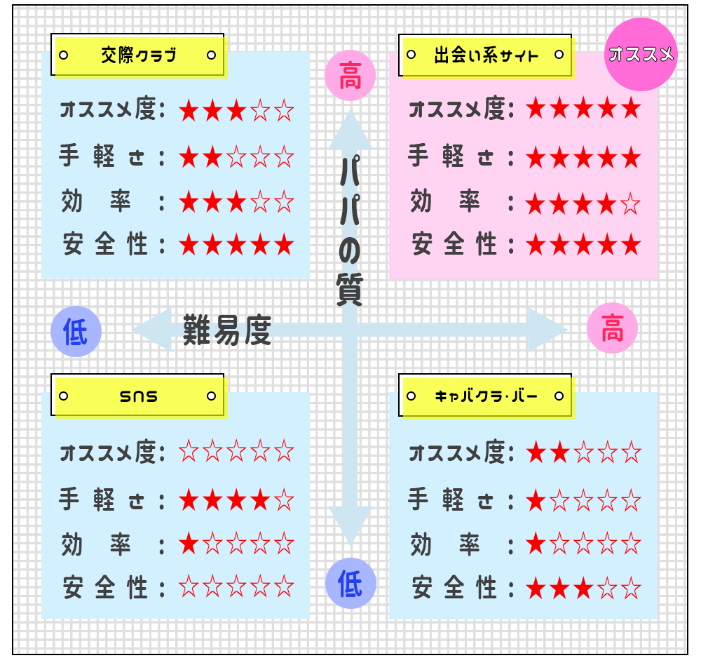 上の表の通り、結論から言うとパパ活アプリやサイトが一番安全で手軽でオススメです!